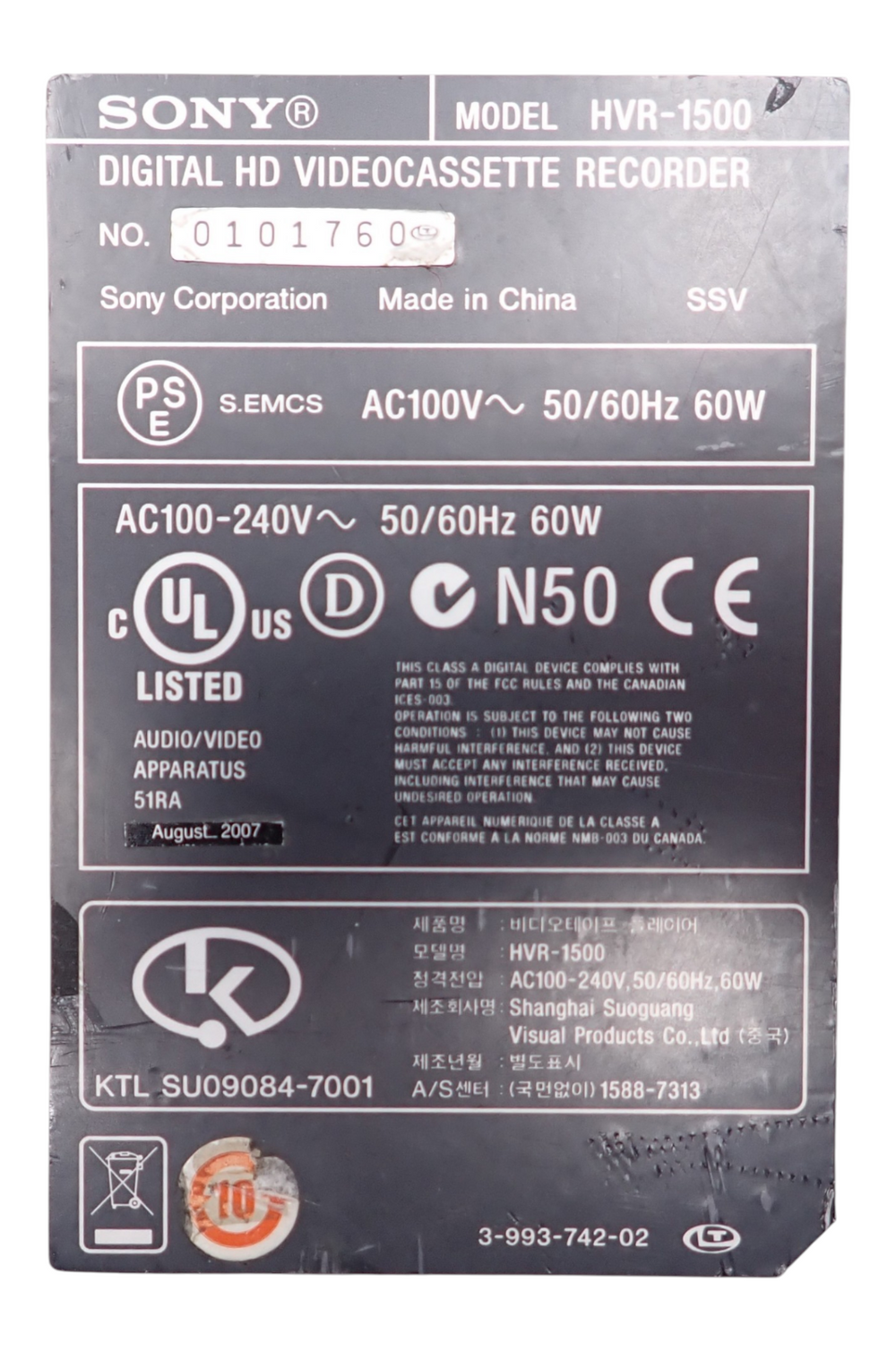 Sony HVR-1500 HDV/DVCAM Digital HD Videocassette Recorder tape Hrs 1290Hrs SN 0101821